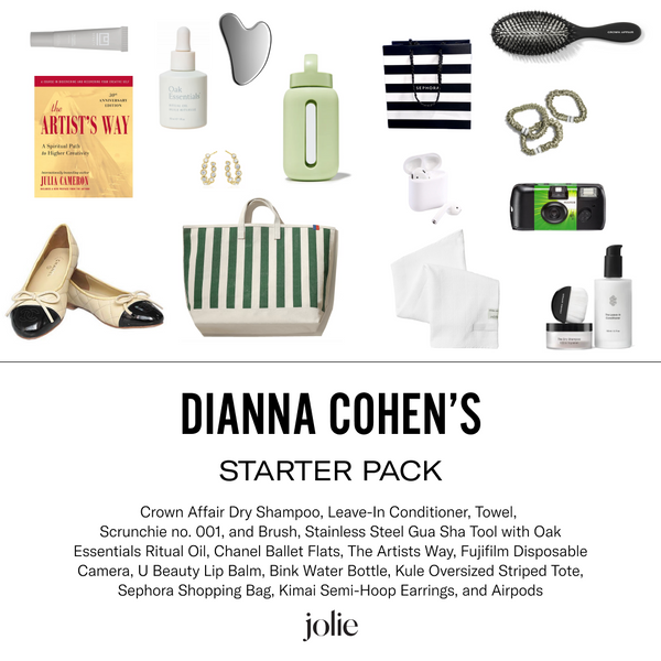 Crown Affair Dry Shampoo, Leave-In Conditioner, Towel, Scrunchie no. 001, and Brush, Stainless Steel Gua Sha Tool with Oak Essentials Ritual Oil, Chanel Ballet Flats, The Artists Way, Fujifilm Disposable Camera, U Beauty Lip Balm, Bink Water Bottle, Kule Oversized Striped Tote, Sephora Shopping Bag, Kimai Semi-Hoop Earrings, and Airpods.