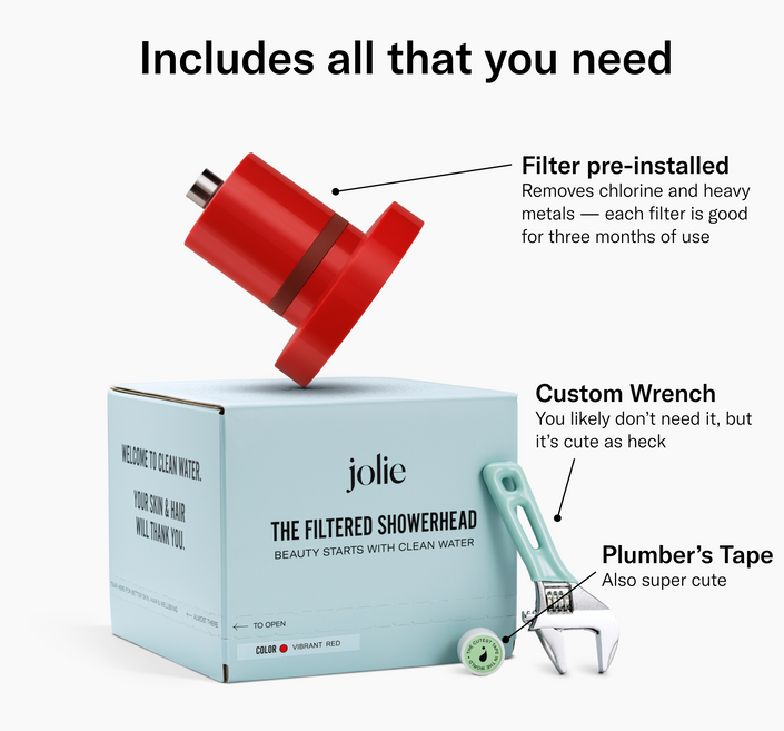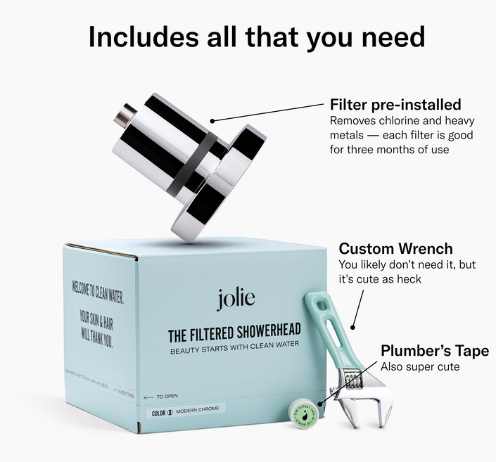 The Jolie Filtered Showerhead removes chlorine, heavy metals, and other contaminants from your shower water.