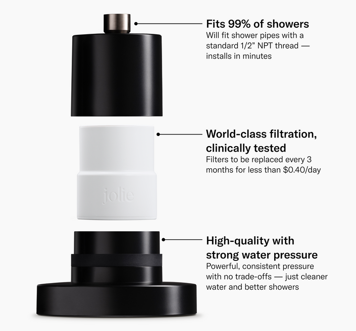 Every time I use to get out of the shower, my whole body would itch sooo much from the hard water. It was incredibly uncomfortable and made showering a task I hated. Now, (with absolutely zero itchiness post shower) I can't wait to shower. I quite literally fill my bath tub from my shower head because I refuse to be in any water that isn't Jolie filtered. My boyfriend (who was a skeptic) is equally as obsessed & might even talk about it more than I do. Only downside? There isn't a Jolie filter for my bathroom sink (to wash face) and for my tub faucet (to fill bath). Bring it on Jolie! Take my money!