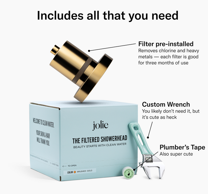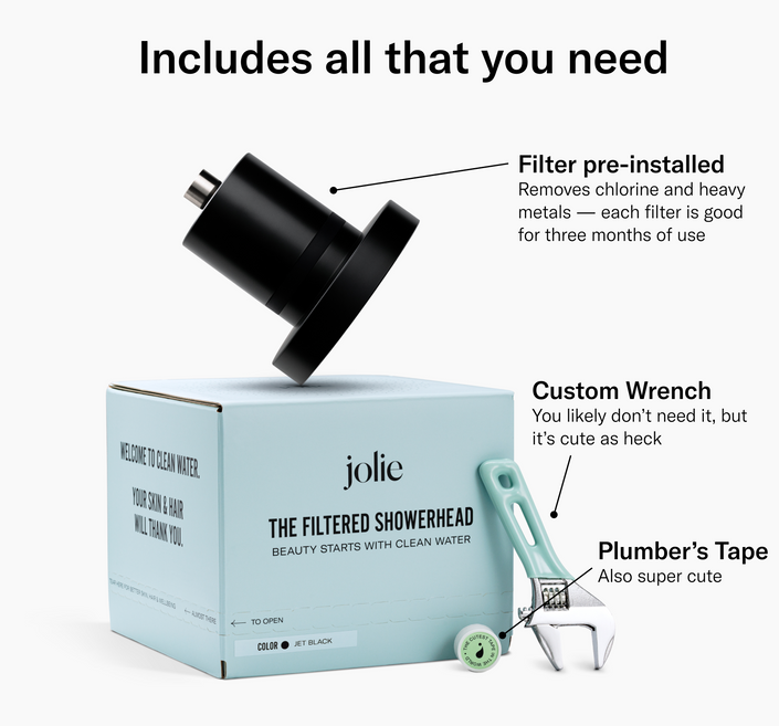 We believe that beauty starts with clean water. The Jolie Filtered Showerhead removes chlorine, heavy metals & other contaminants from your shower water — to improve your skin, hair and wellbeing.